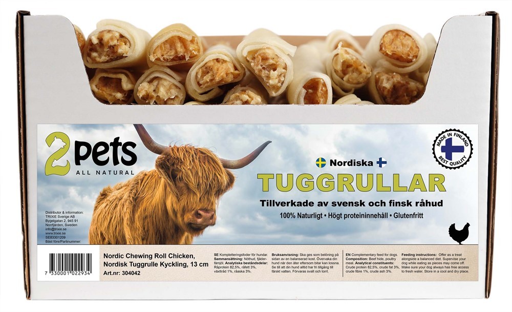 Ge din hund en smakrik belöning med Nordiska Tuggrullar med fyllning från 2Pets, tillverkade av högkvalitativ råhud från Sverige och Finland. Dessa tuggrullar erbjuder ett naturligt sätt att tillfredsställa hundens tuggbehov samtidigt som de bidrar till renare tänder och fräschare andedräkt.
