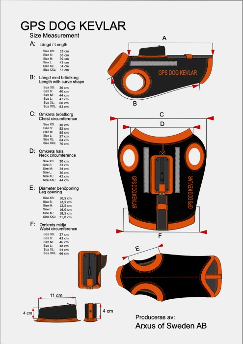 | Storlek | Längd | Längd bröstkorg (cm) | Omkrets runt bröstkorg (cm) | Omkrets hals (cm) | Diameter benöppning (cm) | Omkrets midjan (cm) |