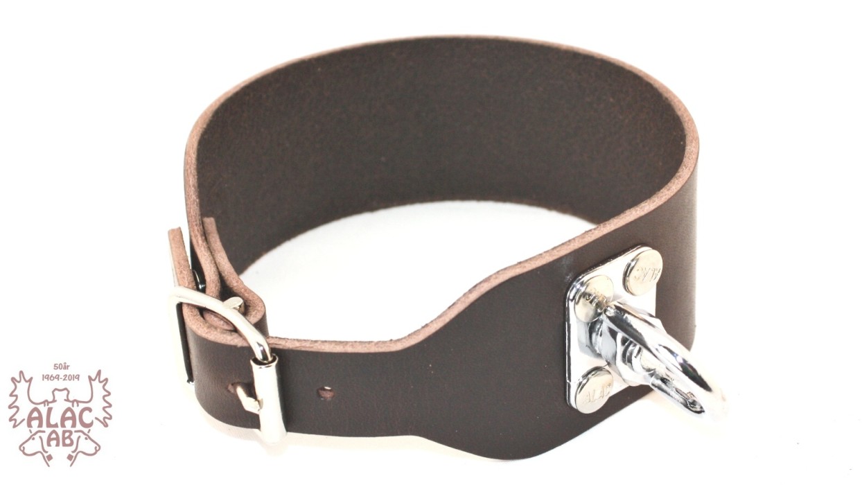 Ett svensktillverkat hundhalsband i läder som lämpar sig utmärkt under spårning. Tack vare den roterande lekaren så kan spårlinan löpa enklare och hunden trasslar inte in sig lika lätt.