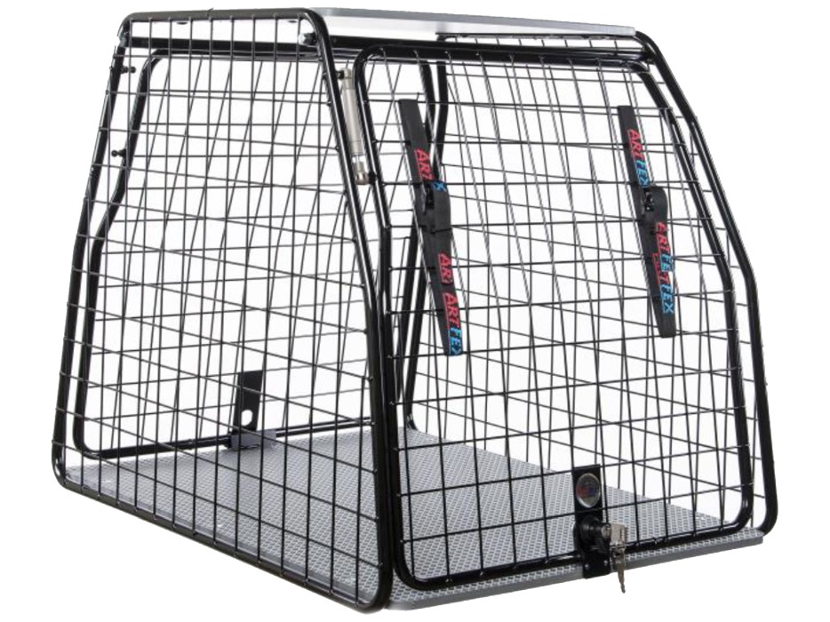 Buren är tyst och säker för hunden att färdas i och är försedd med ett lås på framsidan, 2 nycklar medföljer.