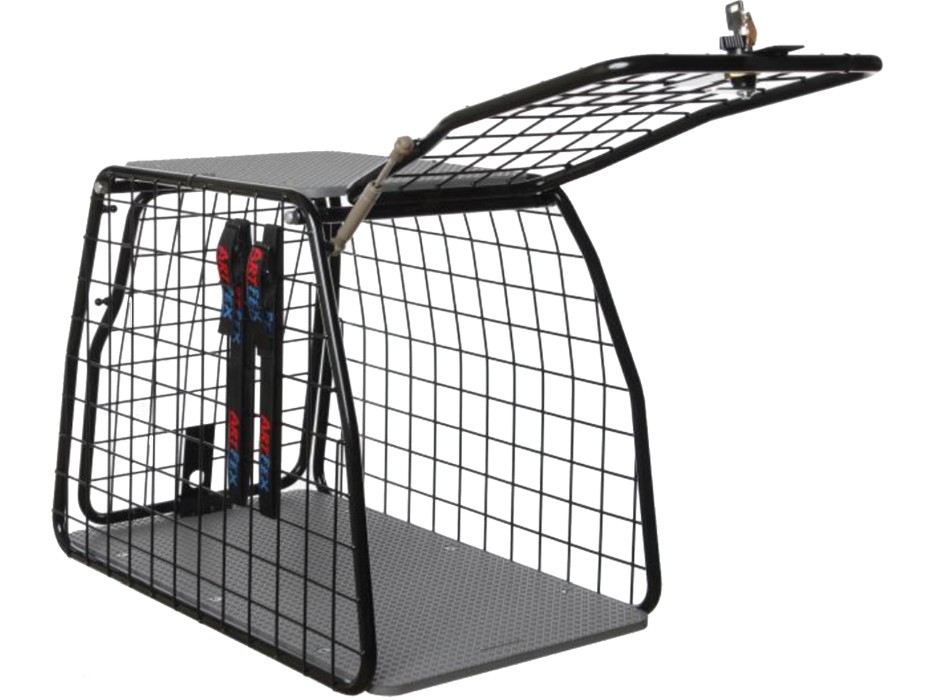 Buren är tyst och säker för hunden att färdas i och är försedd med ett lås på framsidan, 2 nycklar medföljer.