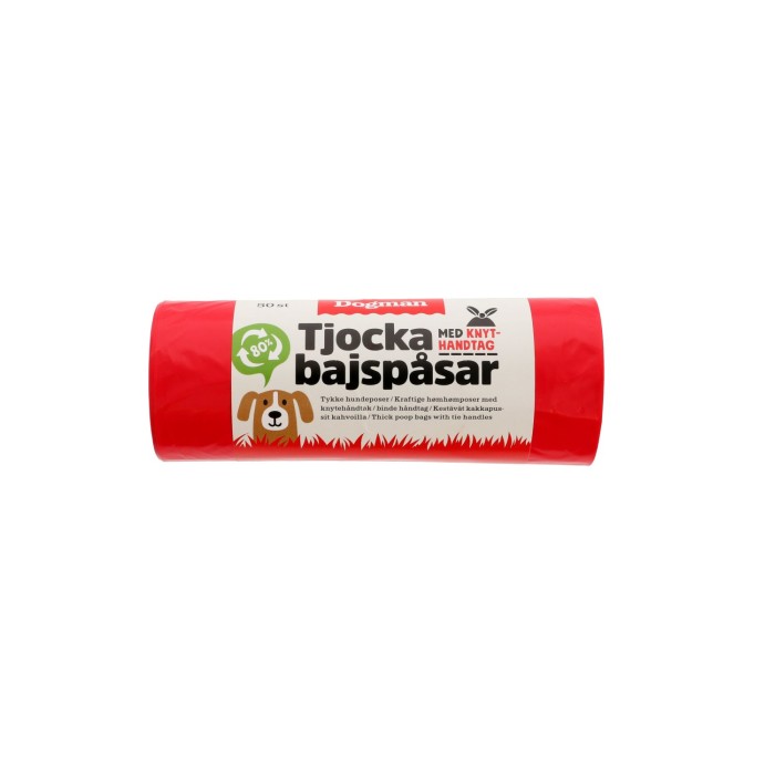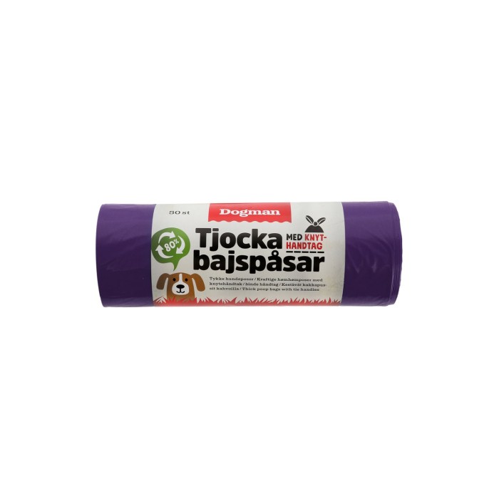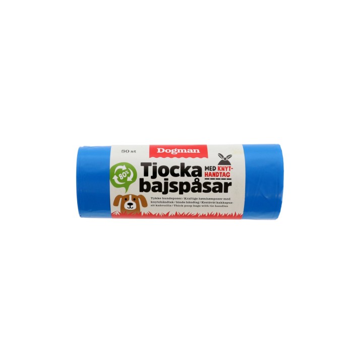 Dogman Bajspåsar Handtag 50-pack är tillverkade av 80% återvunnen plast och har smidiga handtag som gör det enkelt att knyta ihop påsarna.