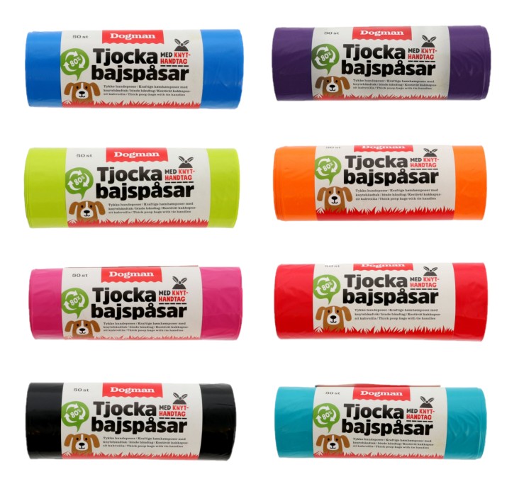 Kraftiga bajspåsar med knythandtag i många snygga färger.