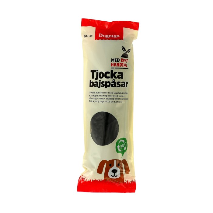Dogman Bajspåsar Handtag 60-pack är tillverkade av 80% återvunnen plast och har smidiga handtag som gör det enkelt att knyta ihop påsarna och bära dem med sig.