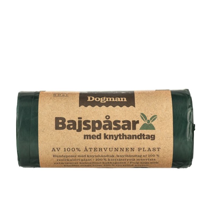 Dogman Bajspåsar 60-pack med knythandtag är tillverkade av 100% återvunnen plast.