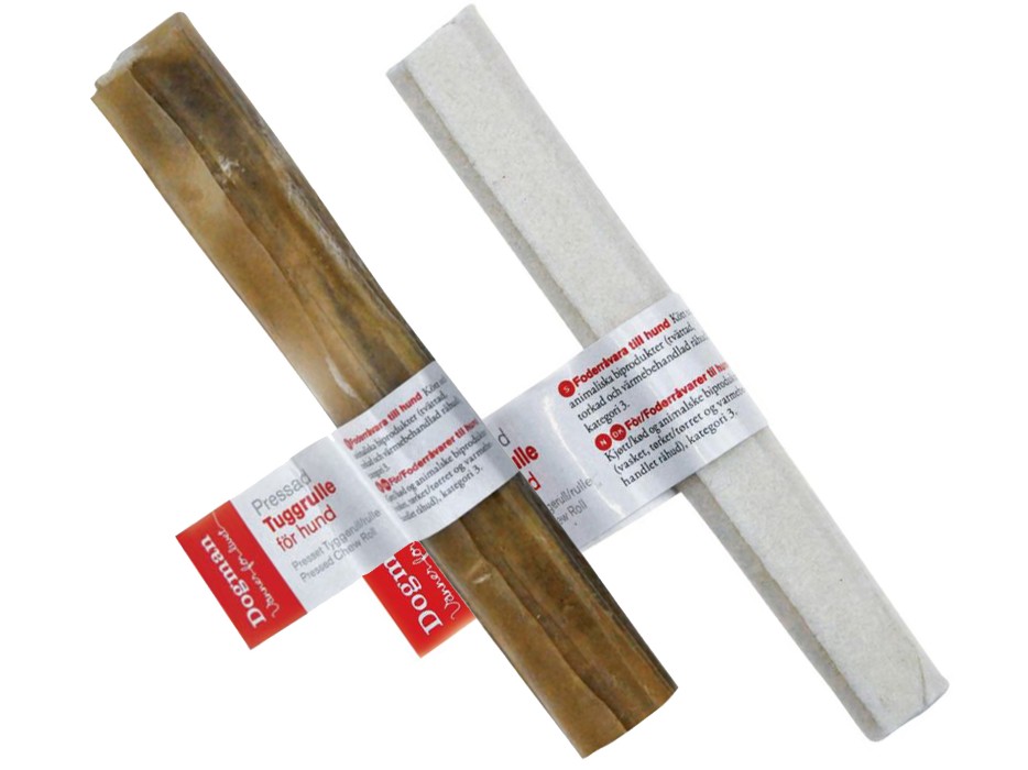 Hårt pressade tuggrullar av råhud från nöt.