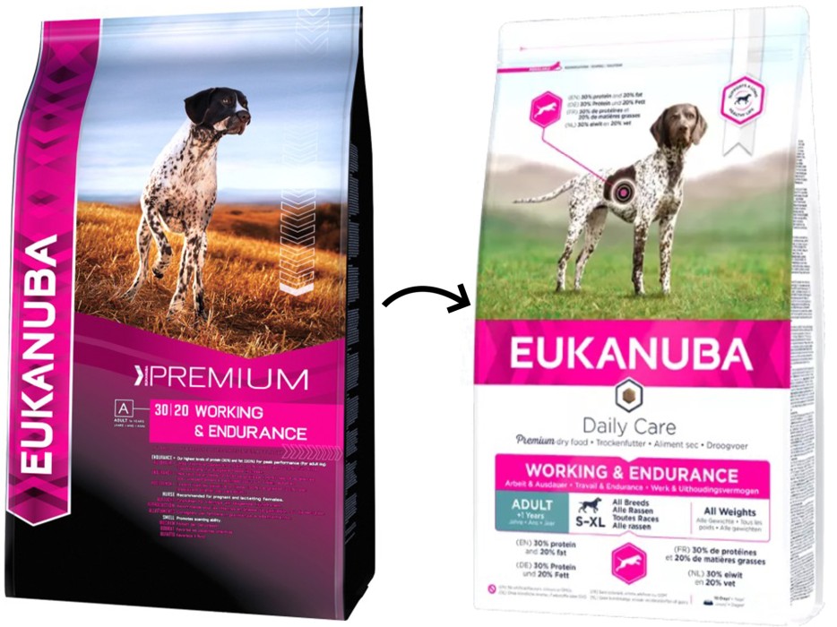 Eukanuba rekommenderar att du matar din hund två gånger dagligen. Dela den dagliga ransonen som visas i diagrammet i två måltider. Din hund kan äta mer eller mindre beroende på ålder, temperament och aktivitetsnivå.