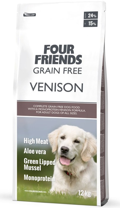 Four Friends Grain Free Venison är ett spannmålsfritt helfoder med hjort och potatis, som är milt och skonsamt för magen.
