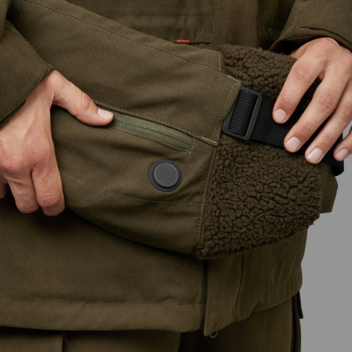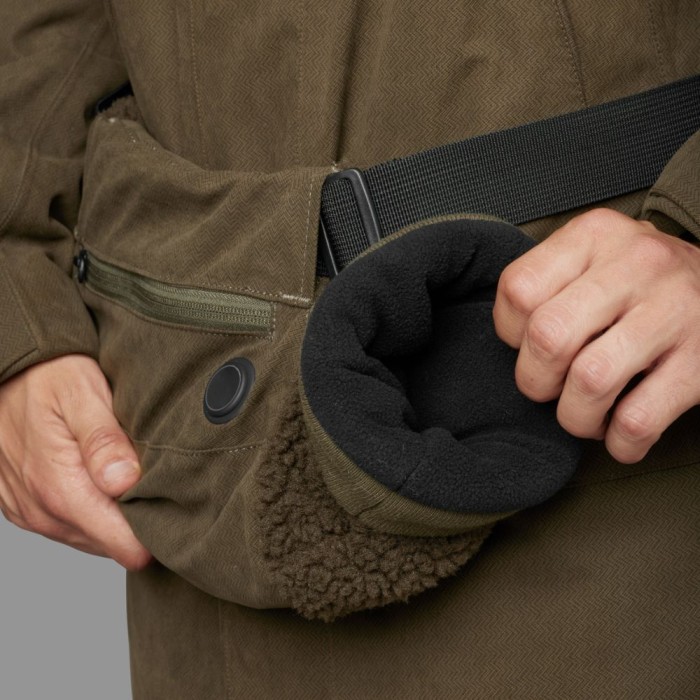 Driven Hunt Heat Muff har en rymlig ficka med dragkedja för tillbehör och ett avtagbart midjebälte med klickspänne så att du bekvämt bär den runt kroppen under rörlig jakt. Den är dessutom kompatibel med Härkila jaktkläder för ett komplett och funktionellt vinterkit.