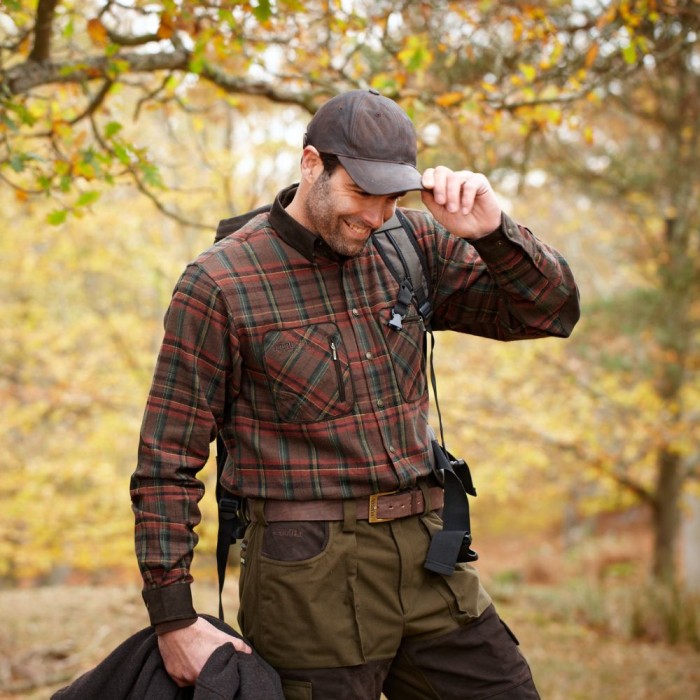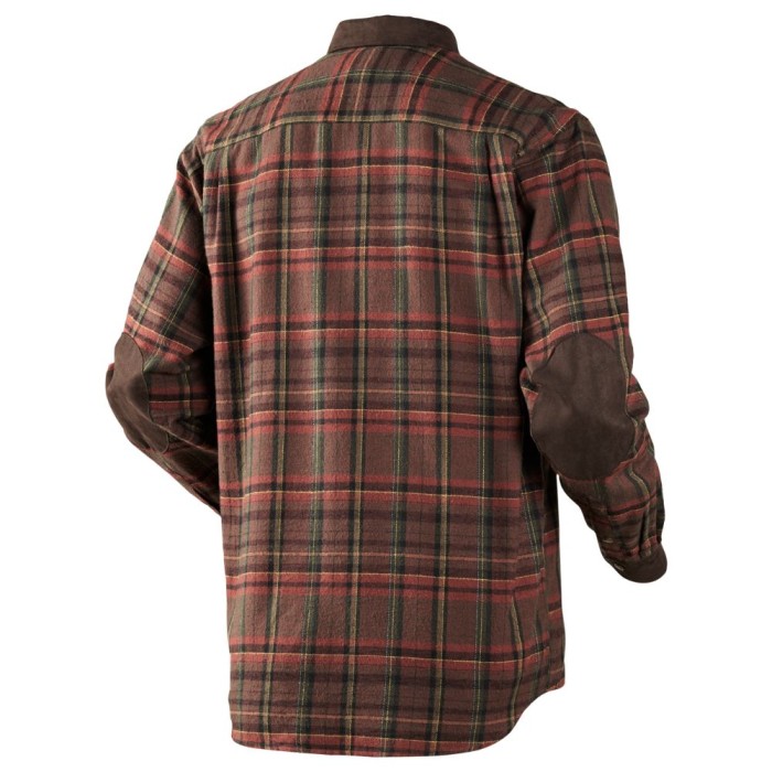 Skjortan har förstärkningar i mockaimitation över utsatta partier som krage, armbågar och manschetter, vilket ökar hållbarheten samtidigt som det ger ett rustikt uttryck. Bröstfickor med dragkedja, tvåläges manschetter och tryckknappar längs knappslån gör skjortan praktisk och lätt att hantera även med handskar. Den kraftiga rödrutiga designen ger dessutom en tidlös stil.