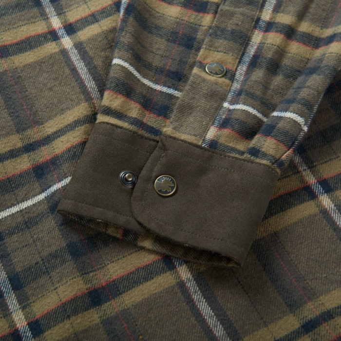 Skjortan är förstärkt med mockaimitation på krage, armbågar och manschetter, vilket ger extra hållbarhet. Tryckknappar i knappslån och manschetterna gör den enkel att hantera med kalla eller trötta händer. Skjortan har två smart placerade bröstfickor med dragkedja – en vertikal och en horisontell, för säker och praktisk förvaring av mindre tillbehör.
