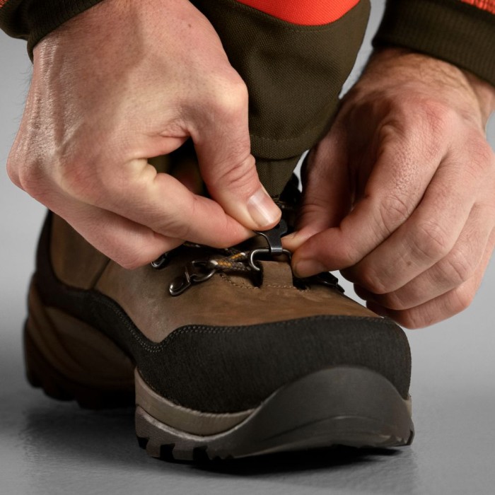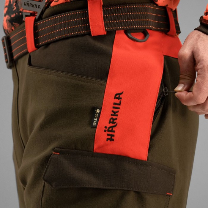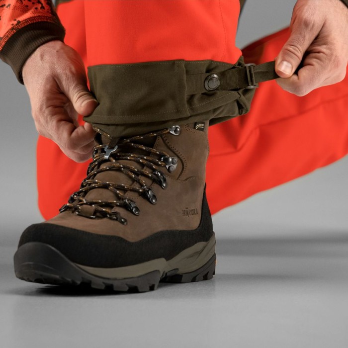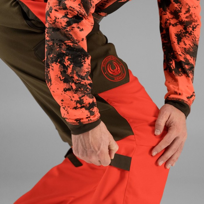 Byxorna har ventilationsdragkedjor med mesh högst upp på låren som ger bra temperaturkontroll under intensiva jakter. Praktiska detaljer som benfickor med dragkedja, patronhållare, kardborreavdelare, formskurna knän, snölås med CORDURA®, samt skokrokar och justeringsremmar gör byxorna till ett tekniskt komplett plagg för jägare som inte kompromissar med funktion eller säkerhet. Den signalfärgade Wildboar orange/Willow green-designen ökar synligheten utan att förstöra siluettbrytningen i skogsterräng.