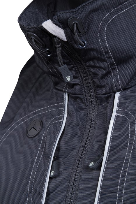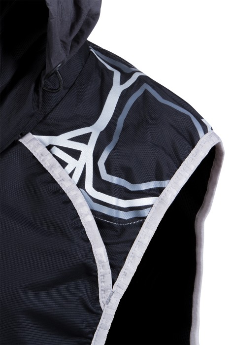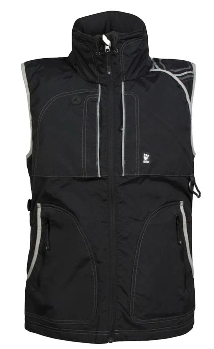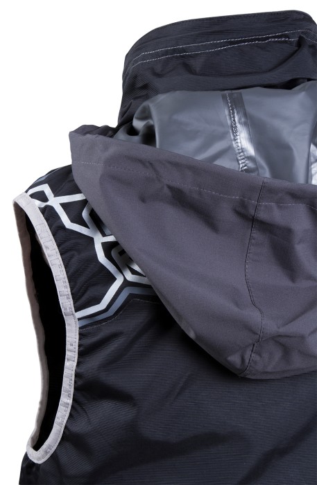 Västen har en justerbar midja och en hög krage med en vattentät huva inuti, som skyddar mot blåst och regn.