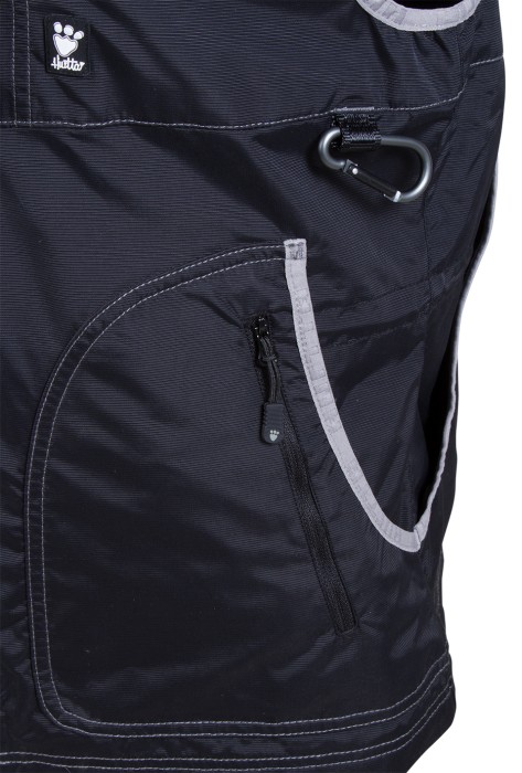 På framsidan finns 4st bröstfickor med blixtlås varav en av dom har en löstagbar ficka för förvaring av hundgodis.