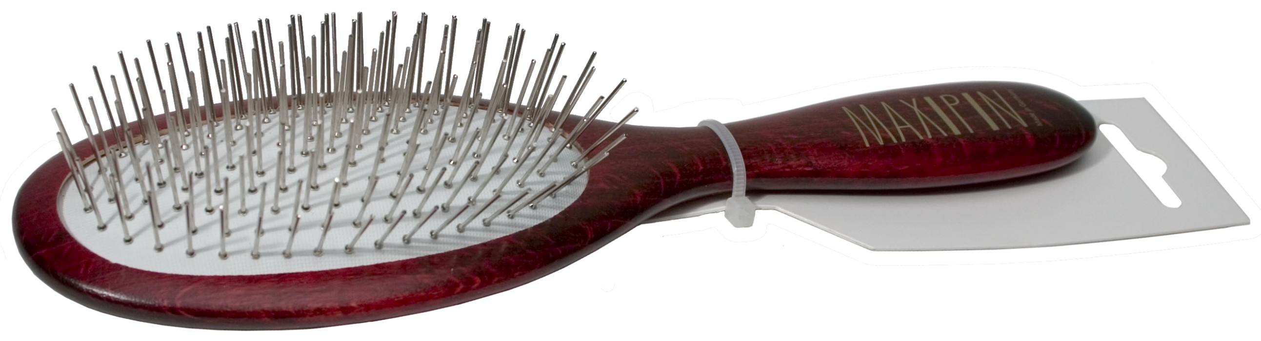 MaxiPin hundborste är oval till formen och av mycket hög kvalitet. Den har en slät trärygg och en mjukt sviktande botten som gör slitaget på pälsen minimalt. Pinnarna är tillverkade i stål och 20mm långa. Dessa pinnborstar används framförallt på långa pälsar utan allt för mycket underull.