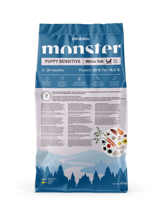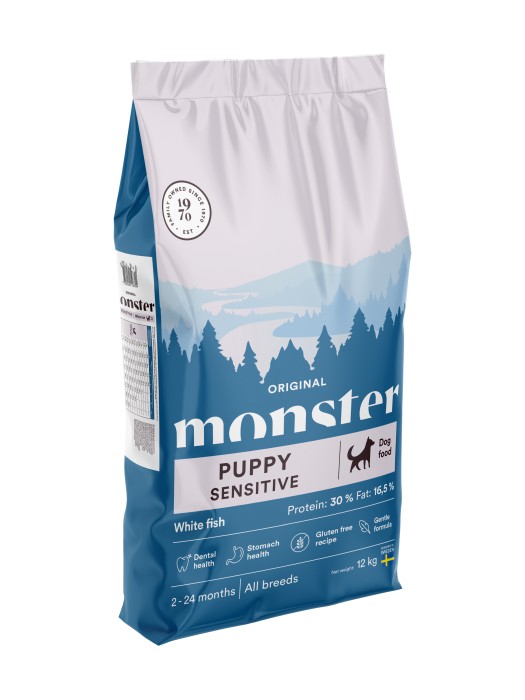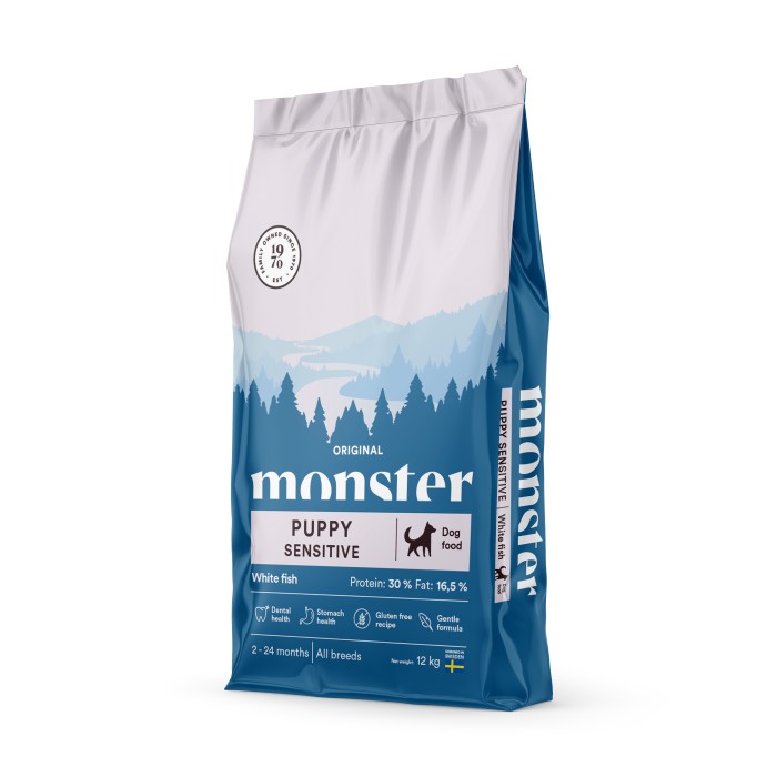 Dog Original Puppy Sensitive White Fish är ett helfoder av superpremiumkvalitet, särskilt utvecklat för valpar med känsligt matsmältningssystem. Med vitfisk som huvudingrediens och en glutenfri formula är fodret skonsamt mot magen och idealiskt för att främja en sund matsmältning redan från tidig ålder. Den balanserade näringsprofilen innehåller allt din valp behöver för att växa och utvecklas på bästa sätt, från 2 till 24 månaders ålder.