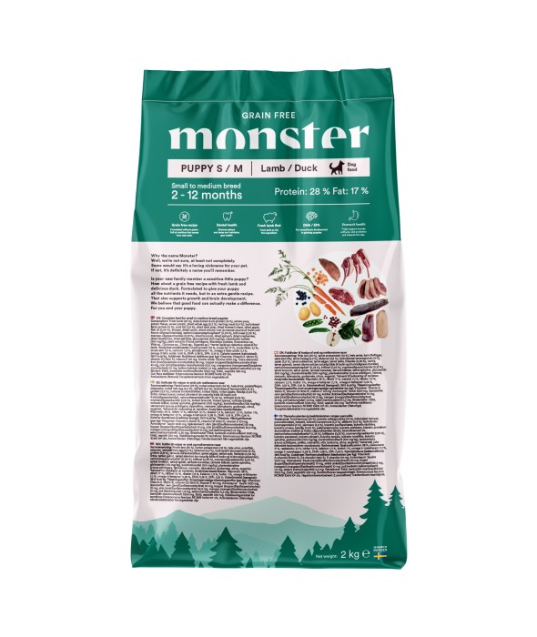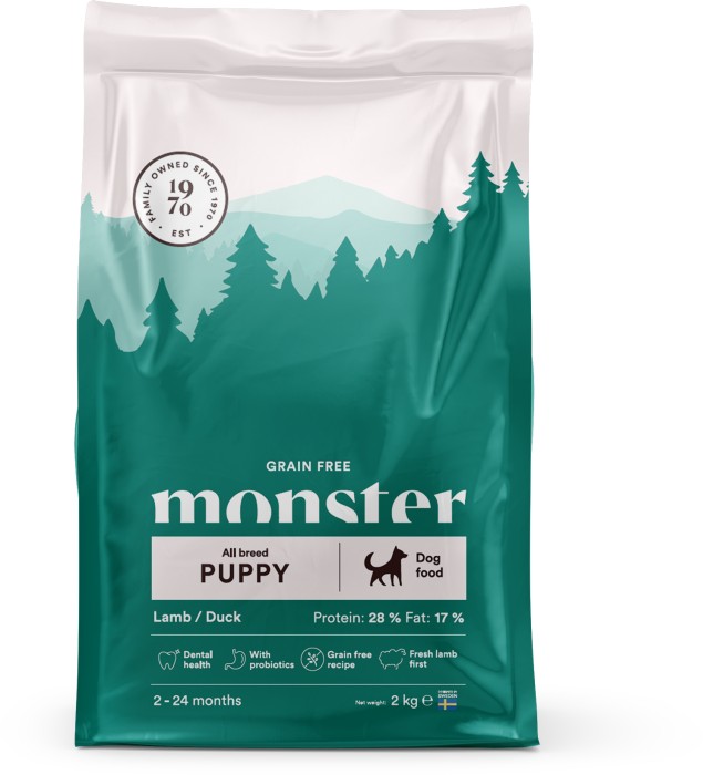 Monster Grain Free Puppy All Breed är ett näringsrikt och välbalanserat valpfoder, särskilt framtaget för att möta behoven hos valpar med känsligt matsmältningssystem. Det spannmålsfria receptet bygger på färskt lamm och delikat anka, två lättsmälta proteinkällor som är skonsamma mot magen samtidigt som de tillför viktiga näringsämnen för tillväxt, energi och mental utveckling.