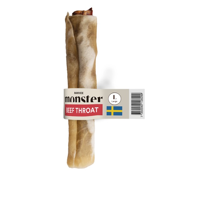Ge din hund en äkta smakupplevelse med Monsters Raw Beef Throat – ett handgjort tuggben från Sverige, tillverkat av 100% svensk nöthud och fylld med smakrik nötstrupe.