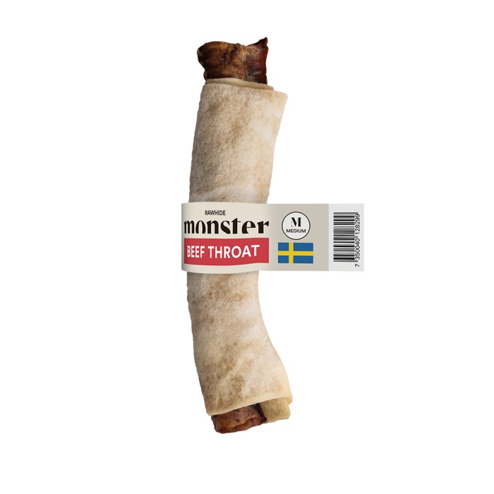 Ge din hund en äkta smakupplevelse med Monsters Raw Beef Throat – ett handgjort tuggben från Sverige, tillverkat av 100% svensk nöthud och fylld med smakrik nötstrupe.