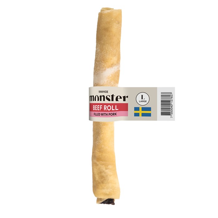 Monster Rawhide Beef Filled Pork – ett handrullat tuggben av 100% svensk nöthud, fyllt med näringsrikt grishjärta. Den unika kombinationen av hållbarhet och oemotståndlig smak gör detta tugg till en perfekt belöning och sysselsättning för din fyrbenta vän.