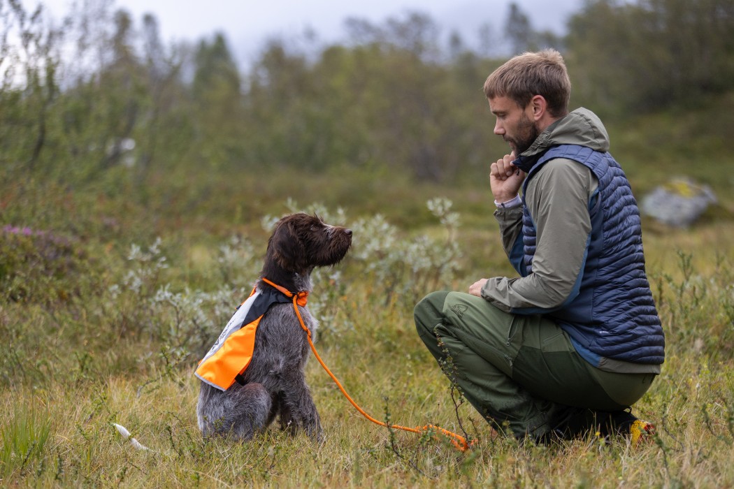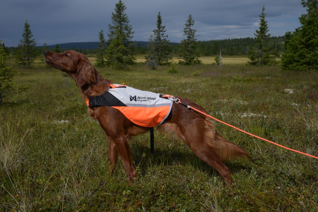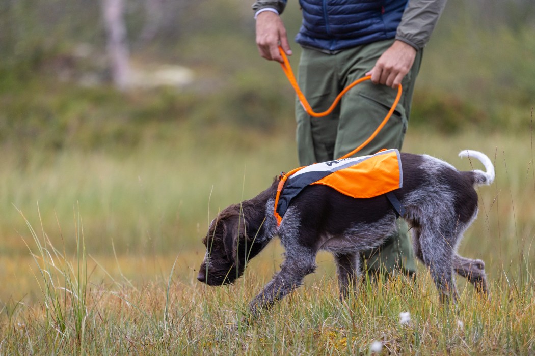 Det slitstarka ripstop-materialet står emot vassa grenar och tuff terräng, och den klara färgen i kombination med reflekterande 3M™-detaljer gör hunden synlig även i svagt ljus. På orange-versionen finns dessutom röda och gula kontrastfält som visar åt vilket håll hunden är vänd en uppskattad detalj vid spårning.