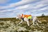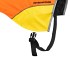 Anpassa västen på din hund genom att justera en elastisk rem runt halsen och bröstet. Bröstbandet fästs med ett plastspänne, gömt inuti de färgade lapparna, för att undvika att fastna i terrängen.