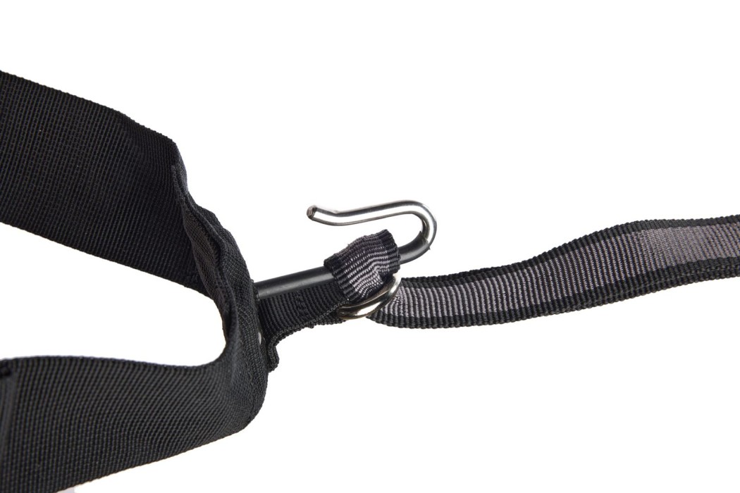 Benremmarna kan enkelt tas bort och dom är även justerbara för en perfekt passform. Fram på bältet finns en krok och en ögla där du fäster kopplet eller linan.