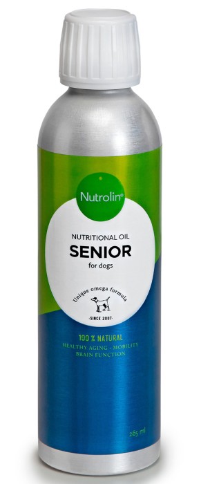 Nutrolin Senior's omega-3-fettsyror, antioxidanter och E-vitamin skyddar den äldre kroppen mot inflammationsreaktioner, optimerar njurarnas funktion hos hundar som lider av njursvikt och ger rörligare leder och ett bättre humör.