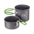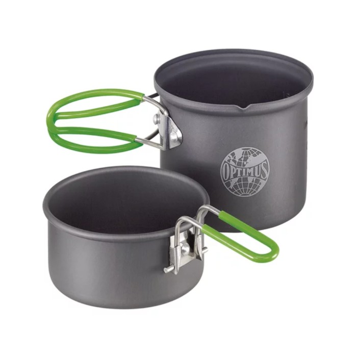 Det medföljande Terra Solo-kokkärlsetet rymmer 0,6 liter och är tillverkat i hårdanodiserad aluminium för låg vikt och hög slitstyrka. Setet består av en kastrull med hällpip och invändig måttskala, samt en liten stekpanna som även fungerar som lock. Fällbara handtag och en praktisk mesh-påse gör det enkelt att packa allt kompakt och ta med sig.