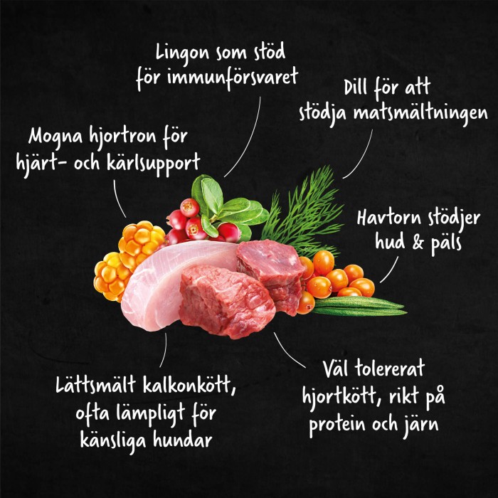 I fodret ingår hela den nordiska naturens superfood-spektrum, så att din hund får alla de vitaminer, mineralämnen och antioxidanter den behöver; hjortron, lingon, havtorn o ch dill - bland annat för att stärka motståndskraften.