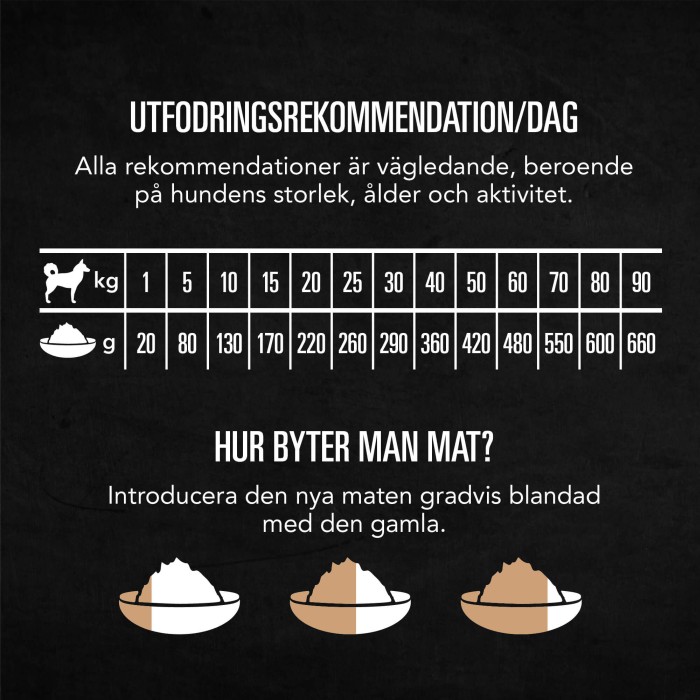 Varje valp är unik och fodergivan kommer att variera beroende på ålder och aktivitet. Använd denna fodergiva som en guide och anpassa givan efter din hundvalps behov.