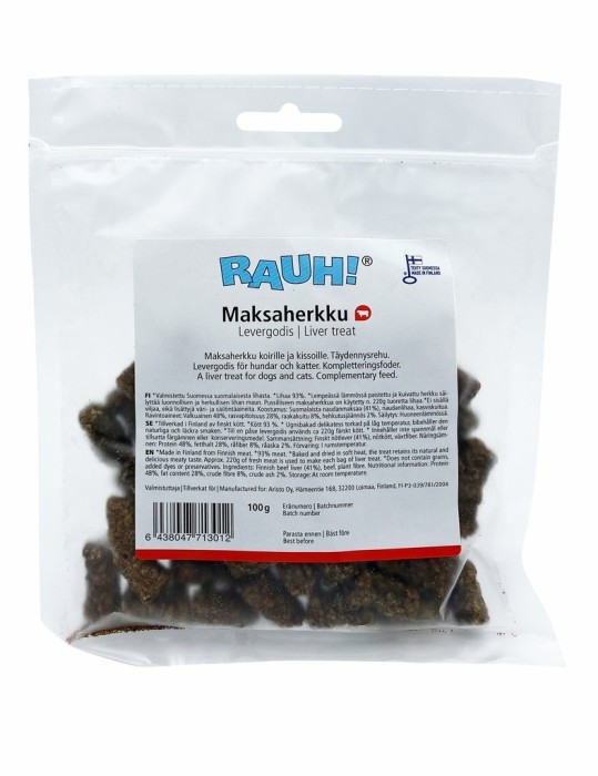Sammansättning: Finskt nötlever (41%), nötkött, växtfiber.