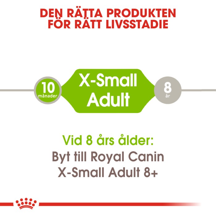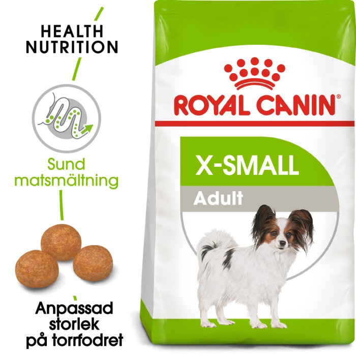 X-Small Adult innehåller näringsämnen som bidrar till en hälsosam hud och päls. Fodret bidrar även till friska urinvägar hos mycket små hundar genom att motverka uppkomsten av urinsten.