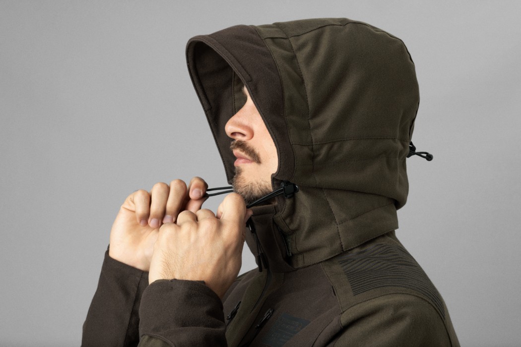 Jackan är utrustad med halkskydd på axeln för vapenrem, justerbar huva och vattenavvisande dragkedjor. Den har även en praktisk innerficka och foder som motverkar att materialet suger upp fukt. Med flera justerbara detaljer får du en bekväm och funktionell passform.