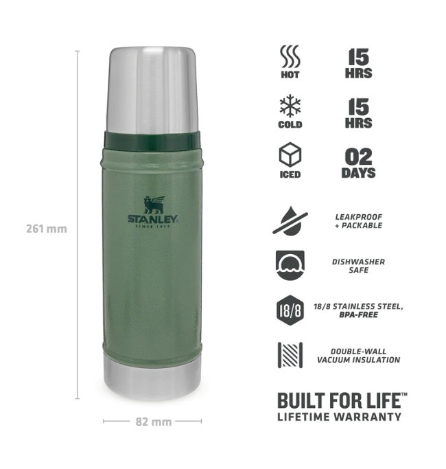 Stanleys Classic termos har samma legendariska konstruktion som orginalet från 1913 och håller ditt kaffe varmt i upp till 24 timmar. Tyngsta argumentet och beviset för kvalitet är att samtliga Stanley termosar har livstids garanti!