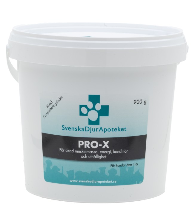Svenska Djurapotekets Pro-X är ett proteinpulver speciellt framtaget för unghundar och vuxna hundar över 12 månader som lever ett aktivt liv. Tillskottet ger stöd till musklerna och kan bidra till mer energi, bättre uthållighet, kondition och prestationsförmåga.