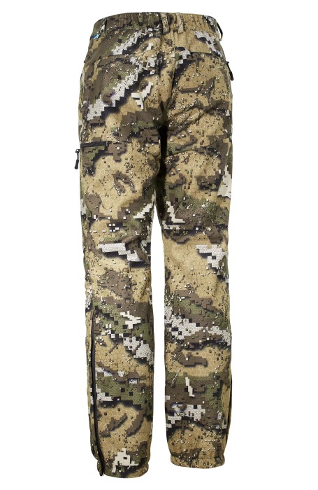 Tyget är vind- och vattentätt, sömmarna är ej tejpade. Borstad utsida ger ett tyst plagg. Insidan är fodrad med mjuk polyester för bästa komfort. Smal passform för optimal rörelsefrihet vid rörlig jakt. Två slimmade benfickor och ventilation i grenen.