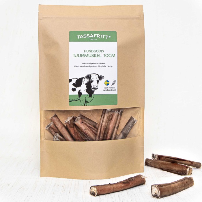 TassaFritt Tjurmuskel 10 cm är ett smakrikt och hållbart hundtugg som passar utmärkt för mindre hundar och valpar. Den kortare varianten är lättare att hantera för mindre käkar, men erbjuder ändå ett långvarigt tuggmotstånd som främjar tandhälsa och sysselsättning.