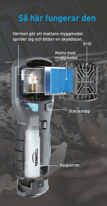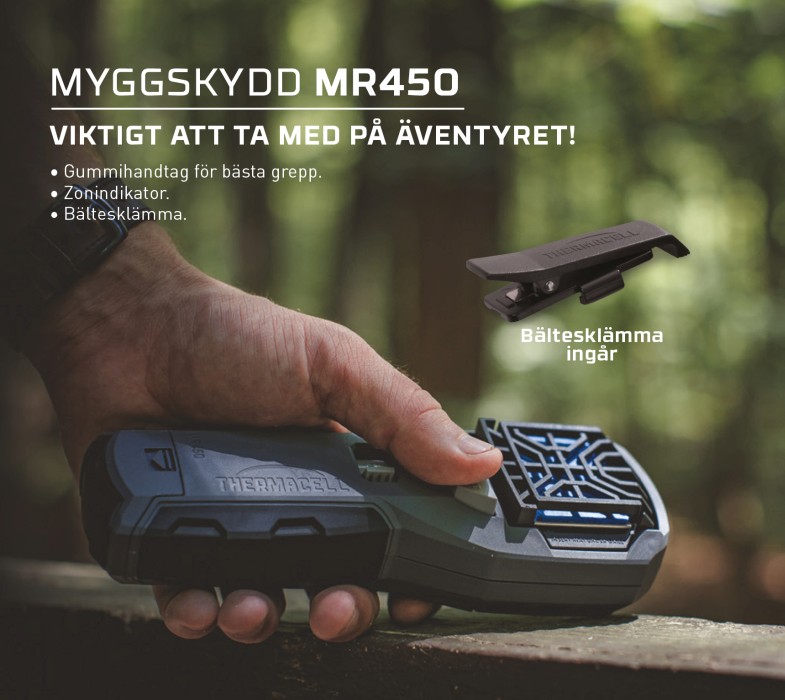 Thermacell MR450 är ett effektivt skydd mot mygg och knott som är enkel att ta med sig då myggskyddsenheten kommer med en bältesklämma. här behöver du alltså inte köpa till något hölster för att kunna fästa myggskyddet på väskan, i kläderna eller i bältet. Modellen har också ett gummerat grepp och en tystare on/off knapp som går att hantera med en hand.
