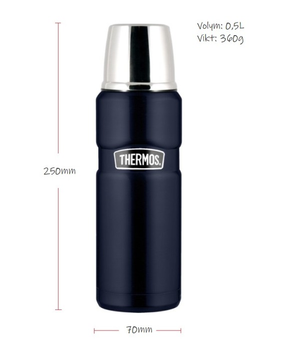 Thermos King Flaska (0,47L) är en populär vakuumisolerad ftermos med skruvkork, designad för att hålla drycker varma eller kalla under långa perioder. Den är en del av Thermos Stainless King-serien, som är välkänd och mycket omtyckt för sin hållbarhet och överlägsna värme och kylbevaring.