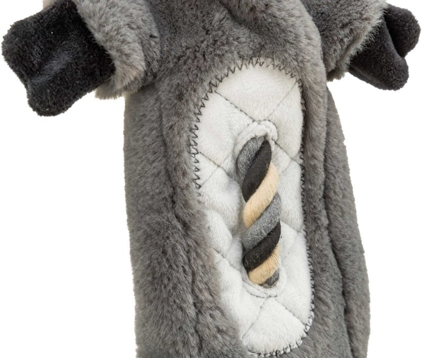 Leksaken har även pipljud och den kombinerade texturen av mjuk plysch och rep gör den både spännande och skön att tugga på.