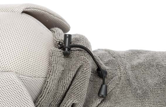 Den är justerbar vid halsringen med hjälp av en dragsko och har ett justerbart magband med spänne runt midjan.
