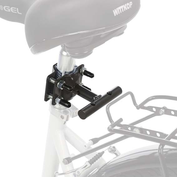 Medföljande utrustning inkluderar förlängningsarm, fäste, ett specialanpassat koppelsystem och fjäder. Den T-formade hållaren monteras vid sitshållaren och gör det möjligt att använda setet på både höger och vänster sida.