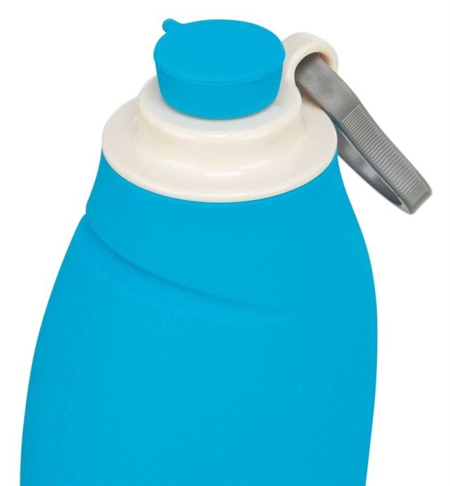 Vik ner silikonskyddet så bildas en skål, och öppna locket för att fylla på. Praktiskt, lätt och perfekt att ha med i väskan eller fästa på bältet när ni är på språng.