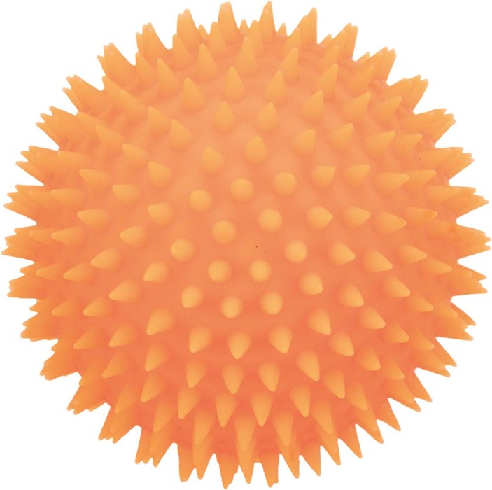 En skojig och stimulerande leksak tillverkad av slitstark vinyl, är denna boll både hållbar och mjuk nog för att vara skonsam mot hundens tänder och tandkött. De taggiga piggarna ger en massageliknande effekt, vilket gör den extra behaglig att tugga på. Dess orangea färg gör den dessutom lätt att hitta både inomhus och utomhus.