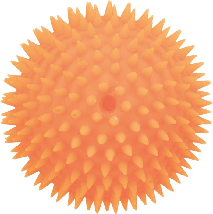 En skojig och stimulerande leksak tillverkad av slitstark vinyl, är denna boll både hållbar och mjuk nog för att vara skonsam mot hundens tänder och tandkött. De taggiga piggarna ger en massageliknande effekt, vilket gör den extra behaglig att tugga på. Dess orangea färg gör den dessutom lätt att hitta både inomhus och utomhus.
