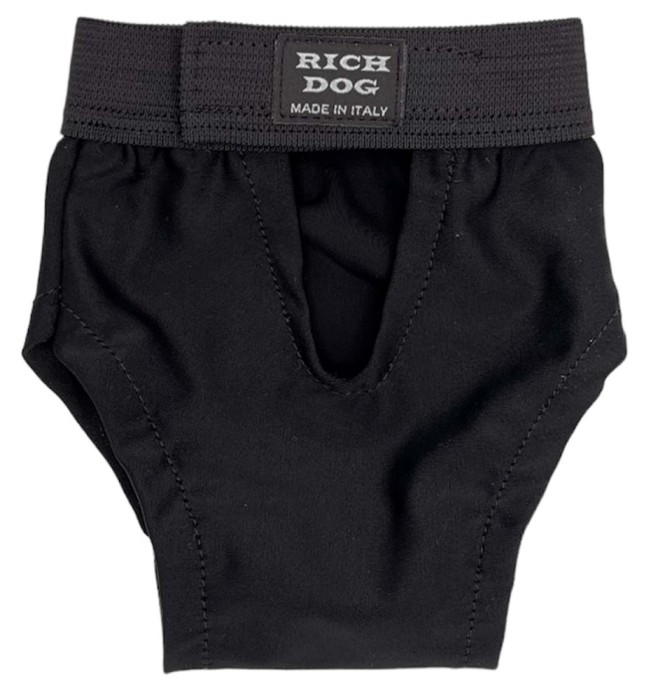 Enkel att ta av och på. Tiken kliver i byxan och du knäpper den runt svansen upp på ryggen.