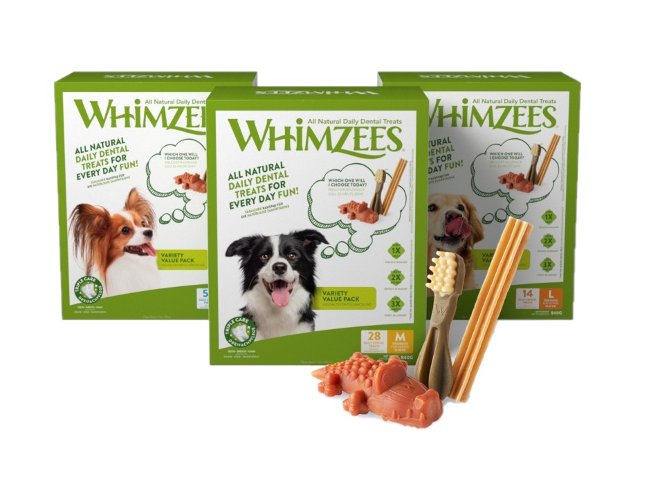 Whimzees Variety Value Box innehåller dom populära vegetabiliska hundtuggen från Whimzees.